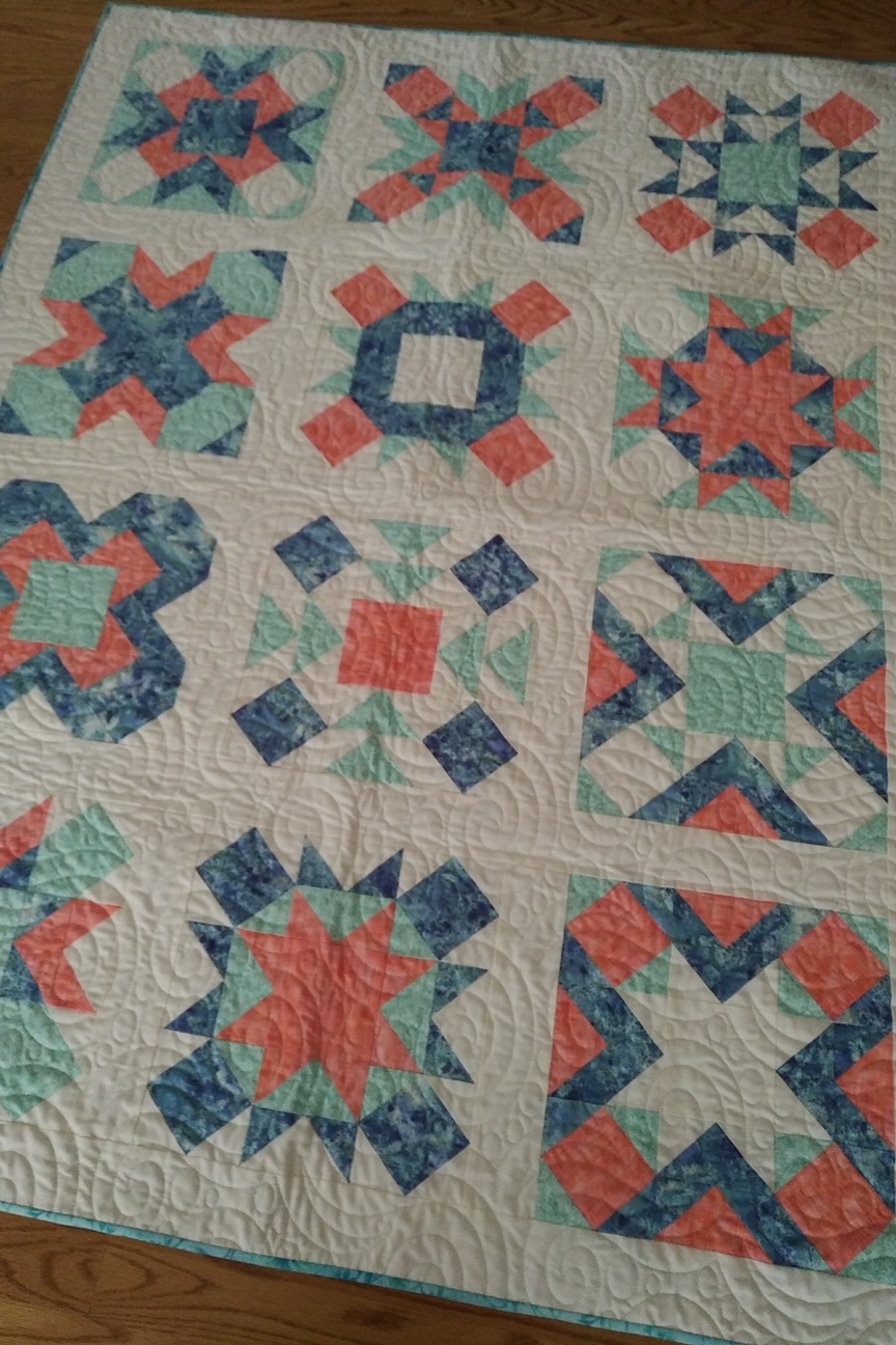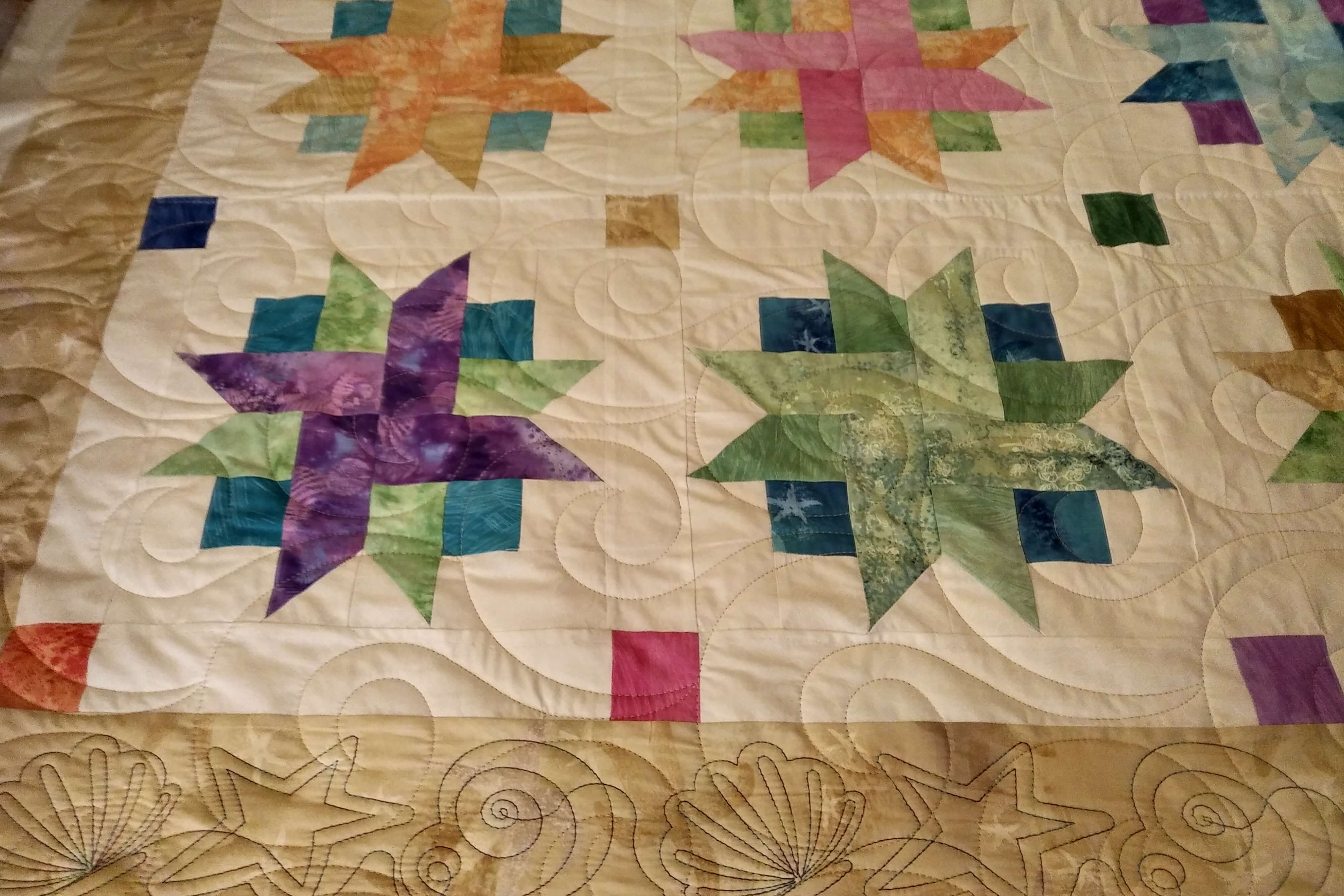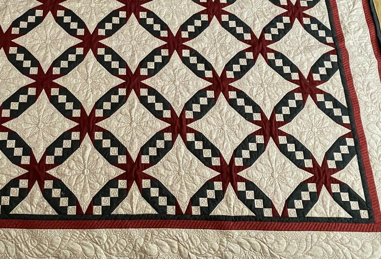 These examples show free-motion, ruler work, and computerized quilting.
