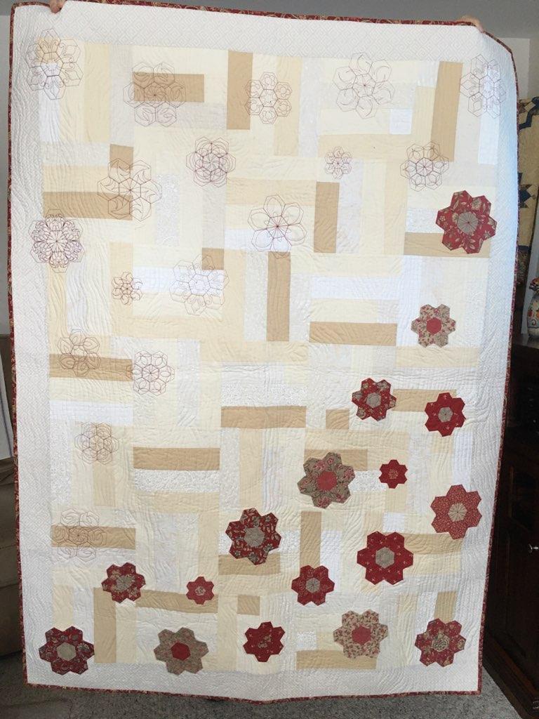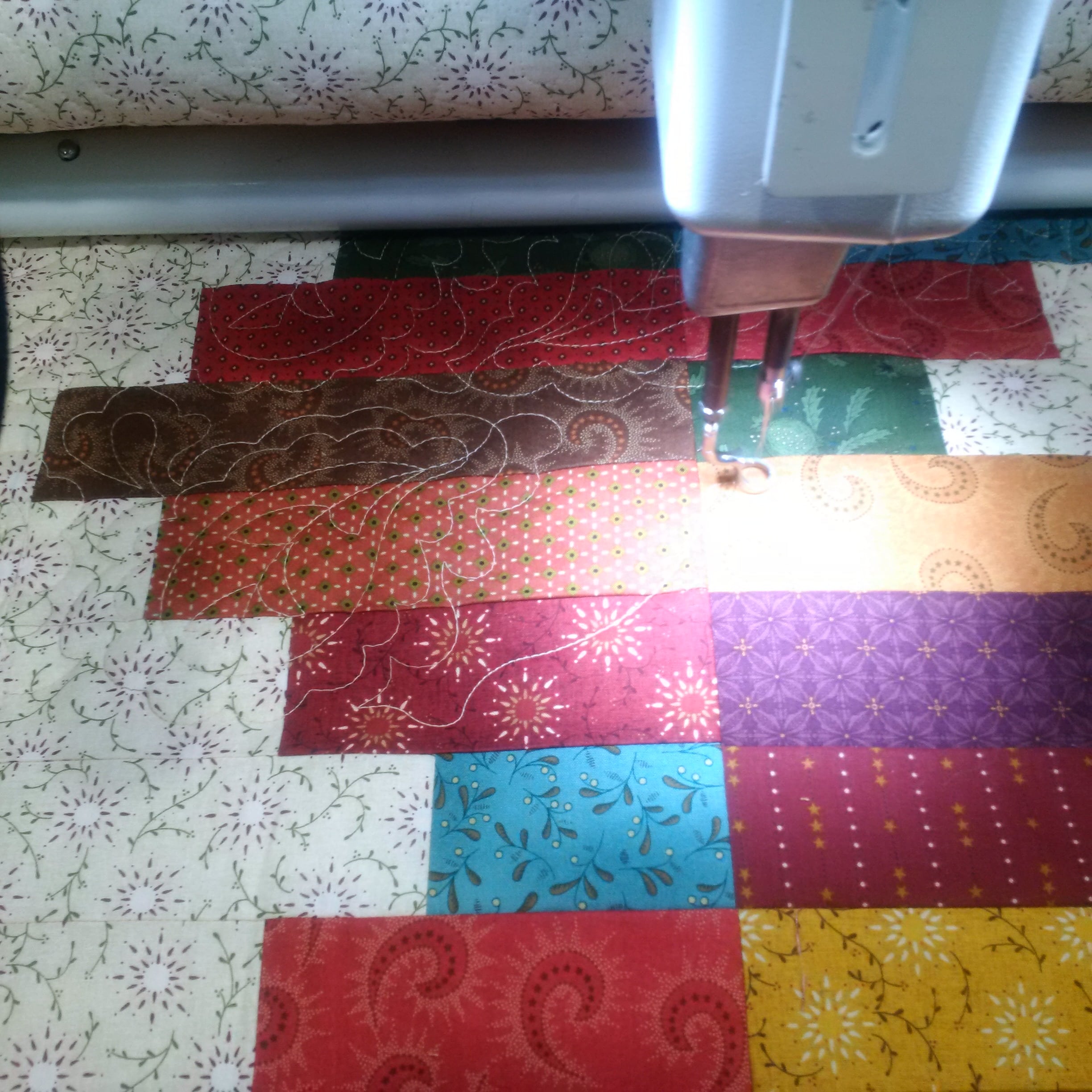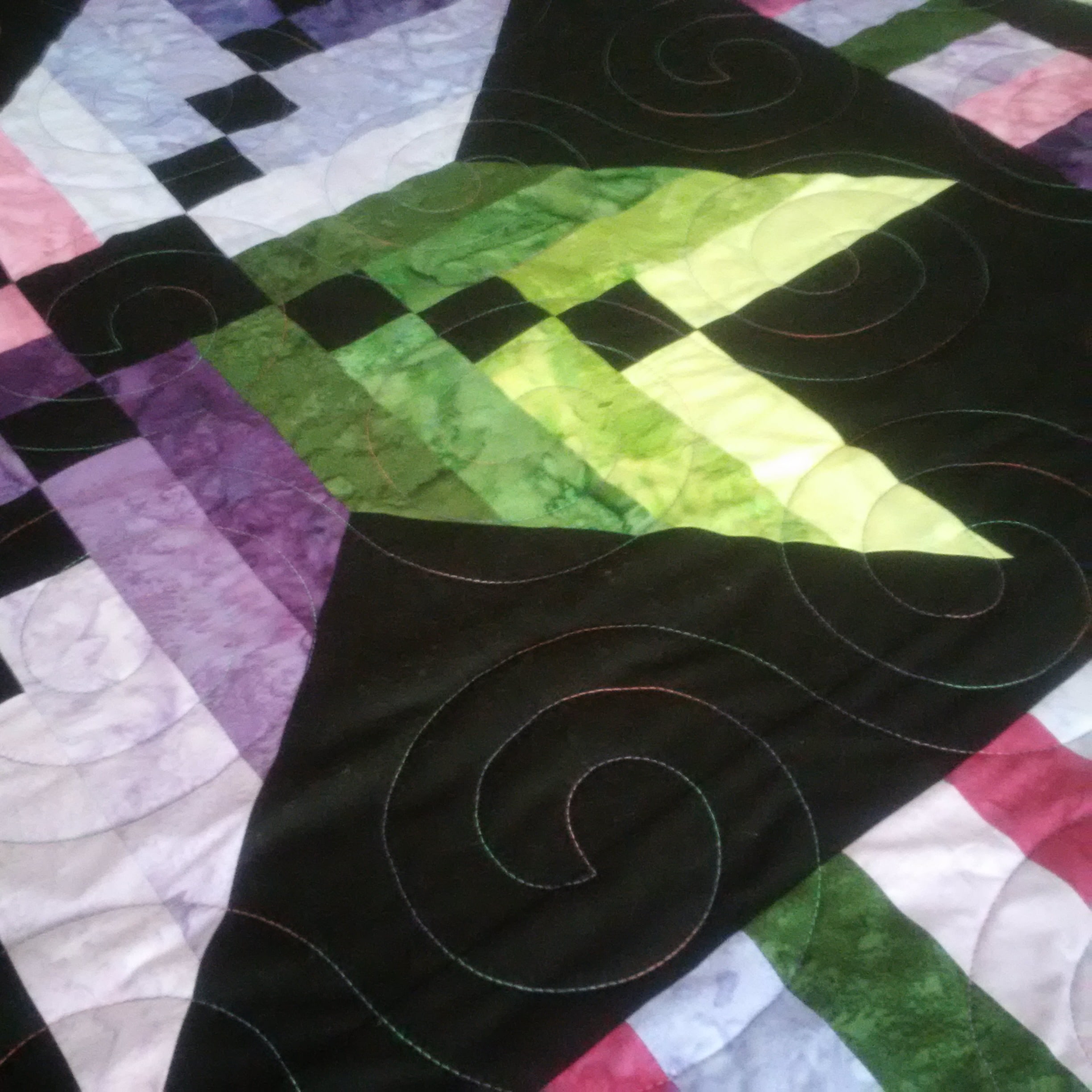 These examples show free-motion, ruler work, and computerized quilting.